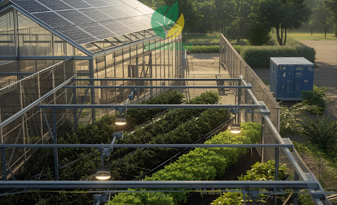 يعمل البيت الزجاجي ضمن شبكة طاقة مصغّرة (Microgrid) تدمج أنظمة استرجاع المياه وإعادة تدوير المغذيات لتحقيق أعلى كفاءة في استخدام الموارد وتقليل التكاليف التشغيلية، مما يجعل المشروع نموذجًا للزراعة المستدامة الحديثة.